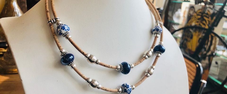 Collier en liège double tour, combiné avec de la céramique, ainsi que des éléments argentés. Fermeture mousqueton.ajustable Disponible … Lire la suite de Collier céramiques florales & bleus