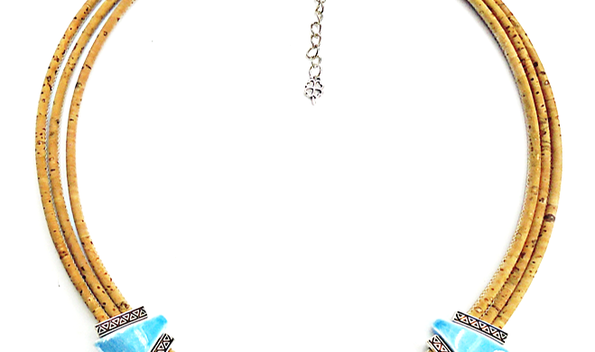 Collier cordon liège, céramique bleu ciel