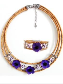 Très belle parure en liège, combiné avec des fleurs roses & petites boules céramiques,