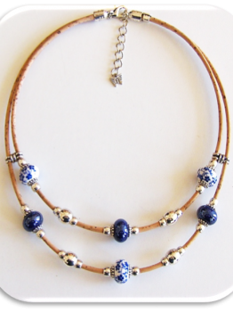 Cork necklace Floral & blue ceramic