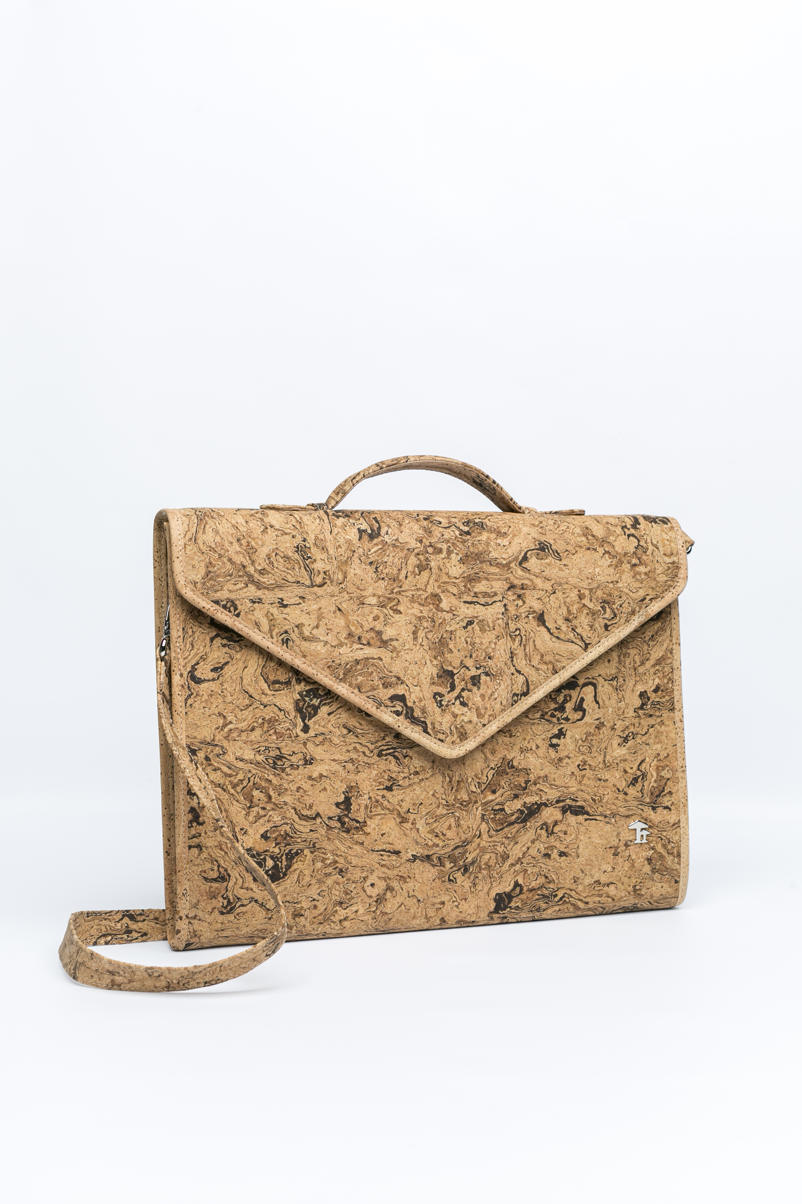 Rigid handbag in Cork, flap closing with magnetic pressure.