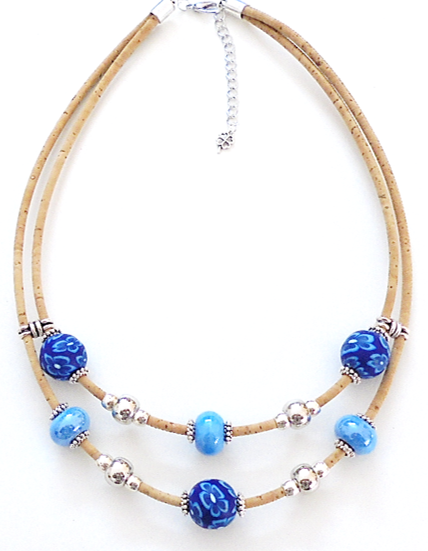 Elegant double turn necklace with silver elements & blue ceramic balls.