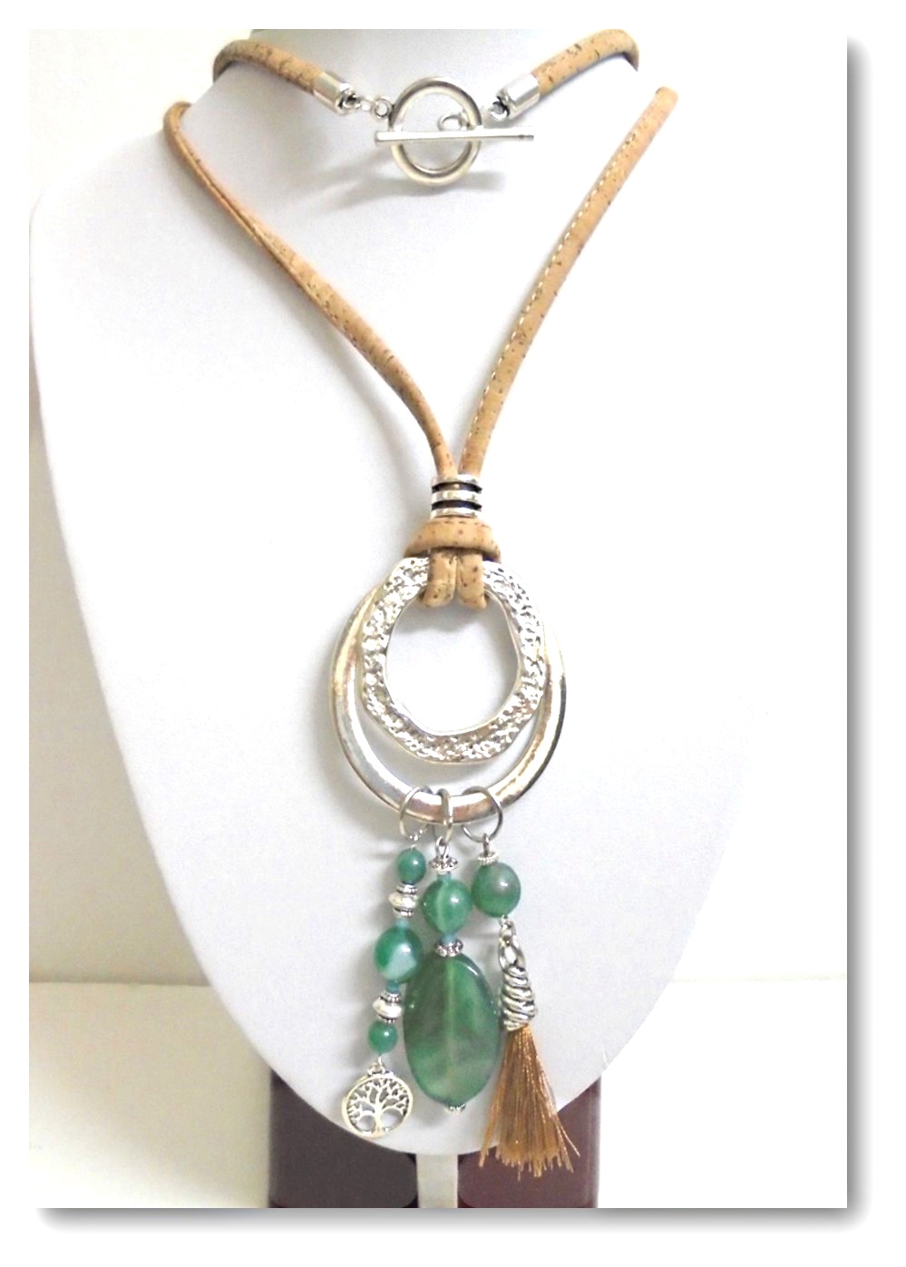 Sautoir en Liège, pierres Jaspe Vert